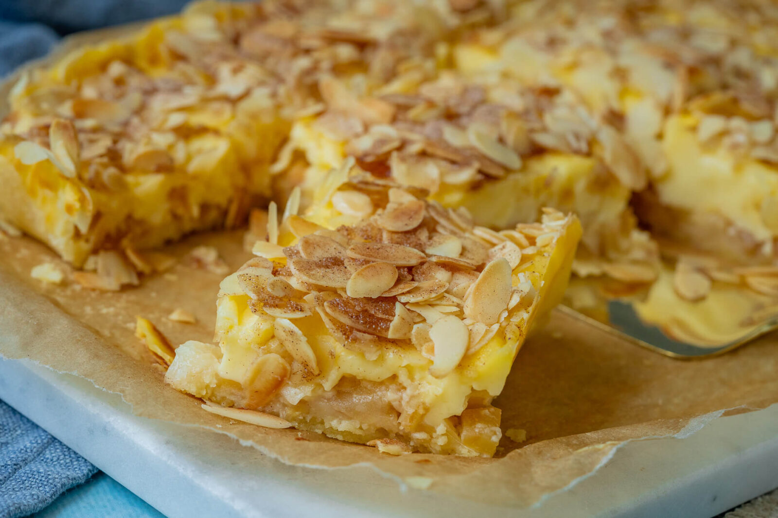 Apfelkuchen mit Pudding Schmand und Streuseln - Unser liebster Blechkuchen