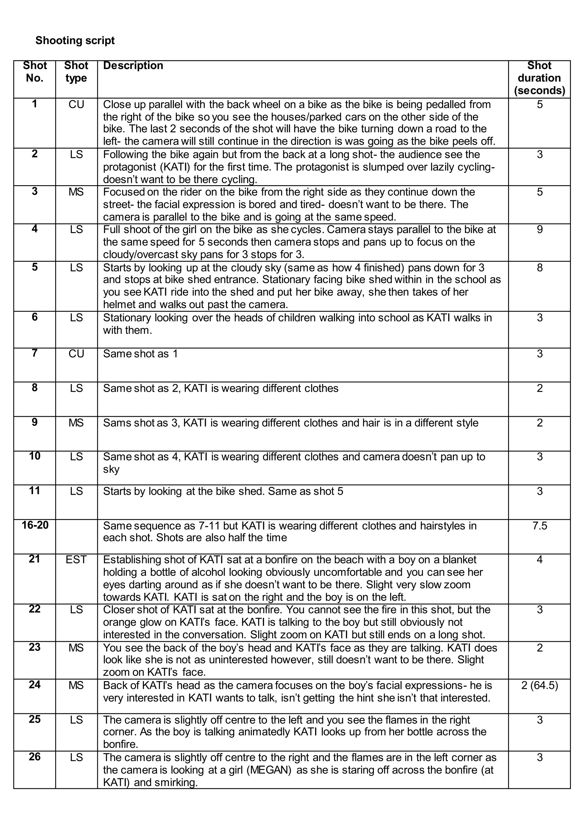 Shooting Script: Camera Shot Type/ Camera Action/ Duration Shot Number ...