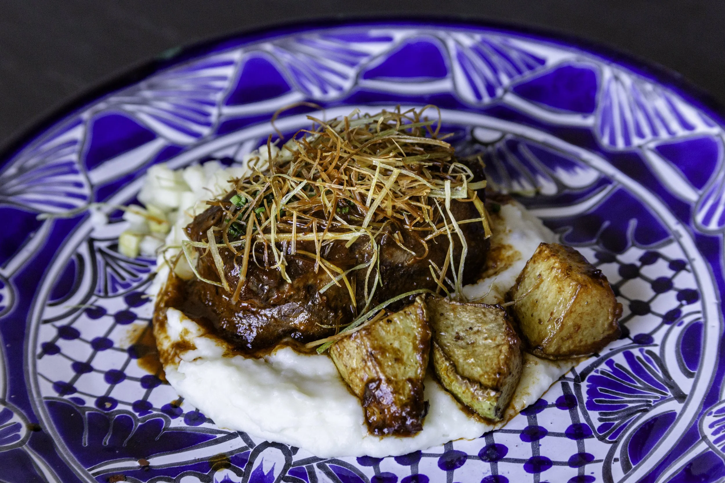 Short Rib Barbacoa with 2 medium fried eggs, onion, red skin potatoes ...