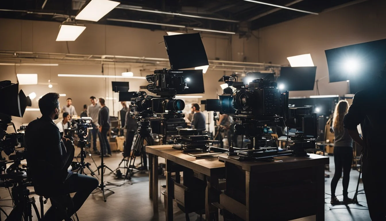 A sophisticated film studio with large cameras lighting rigs and set ...