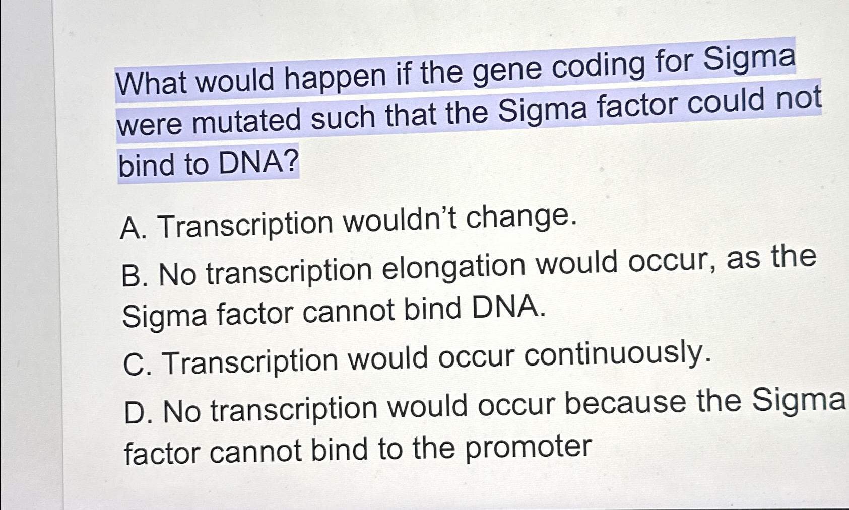 Solved What would happen if the gene coding for Sigma were | Chegg.com
