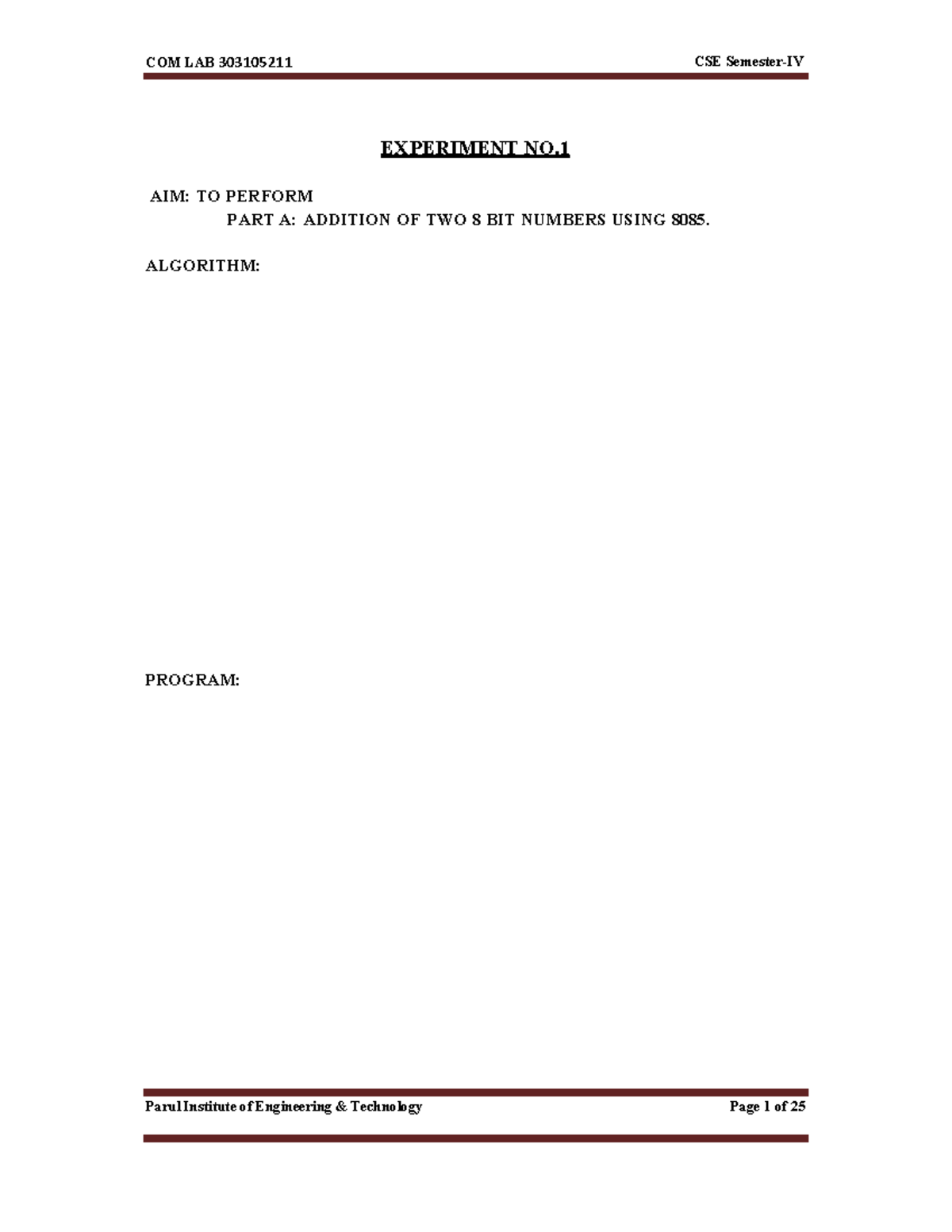 COM LAB 303105211 CSE EXPERIMENTS: 8085 Assembly Language Programs ...
