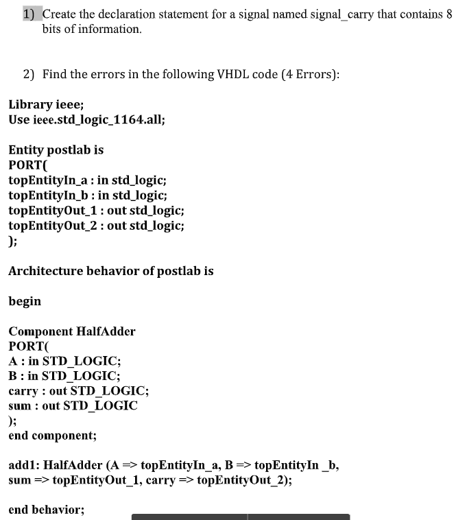 Solved 1) Create the declaration statement for a signal | Chegg.com