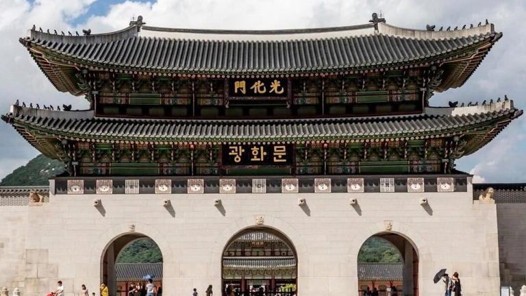 Airplane landing in Seoul. Plane travel to South Korea arrive with ...