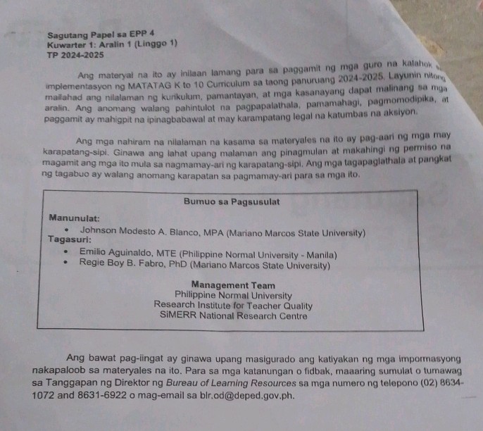 Sagutang Papel sa EPP 4 Kuwarter 1 Aralin 1 | StudyX
