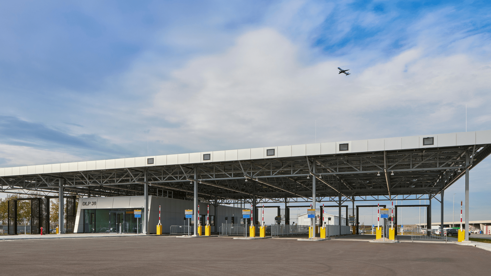 Simple outline of a checkpoint building with an open barrier and a ...
