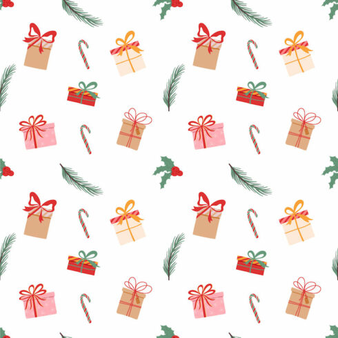 Festive Christmas Seamless Pattern with Gifts and Trees