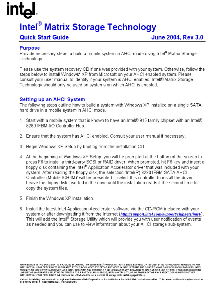 Intel Matrix Storage Technology: Quick Start Guide June 2004, Rev 3.0 ...