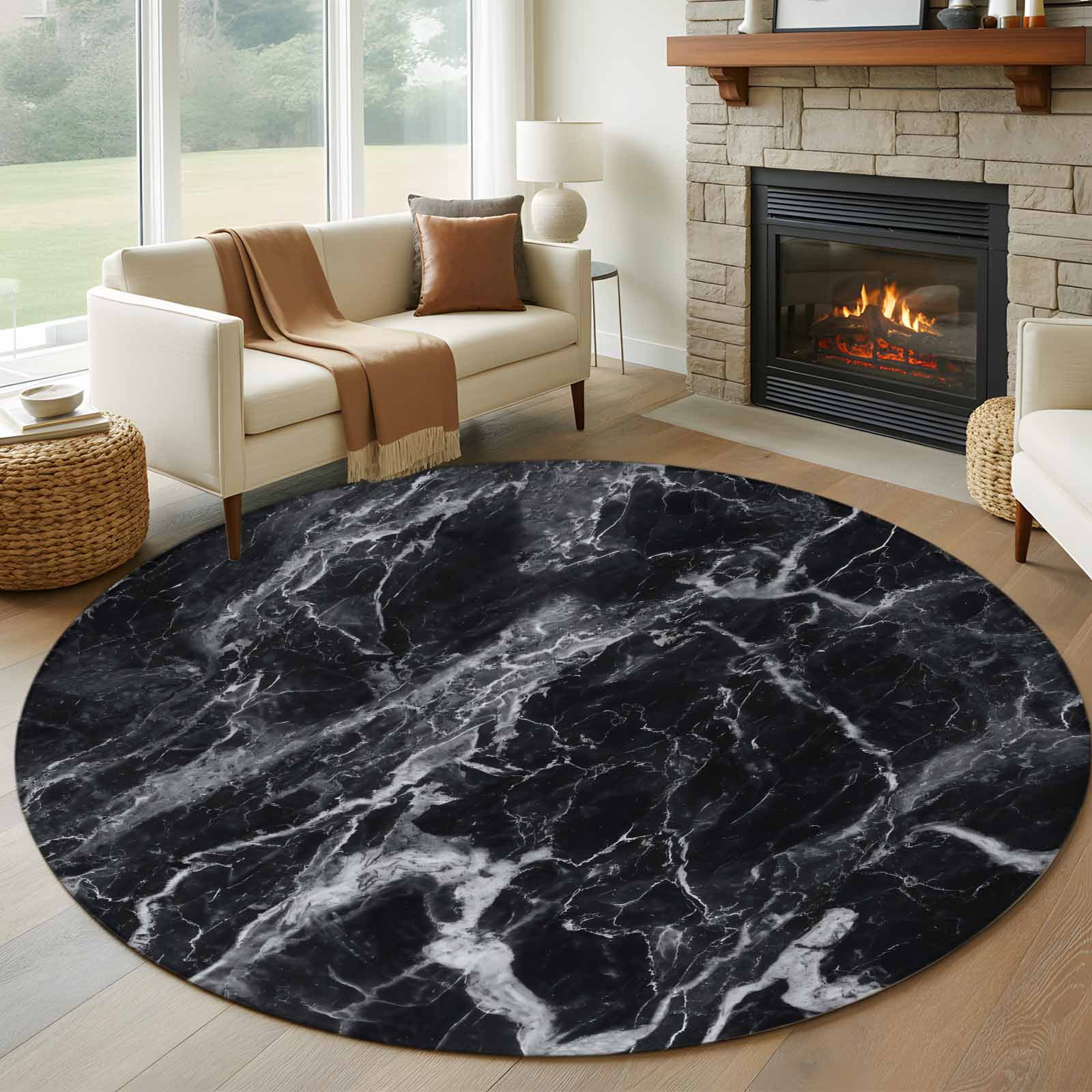 Abstract Art 8FT Round Area Rugs for Living Room Dark Black Marble ...