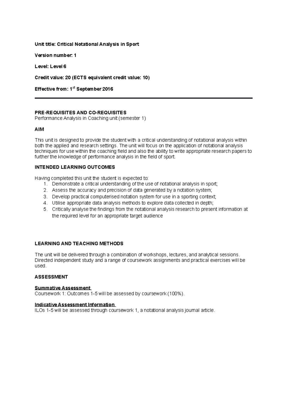 Critical Notational Analysis in Sport - Unit Spec v1 - Unit title ...