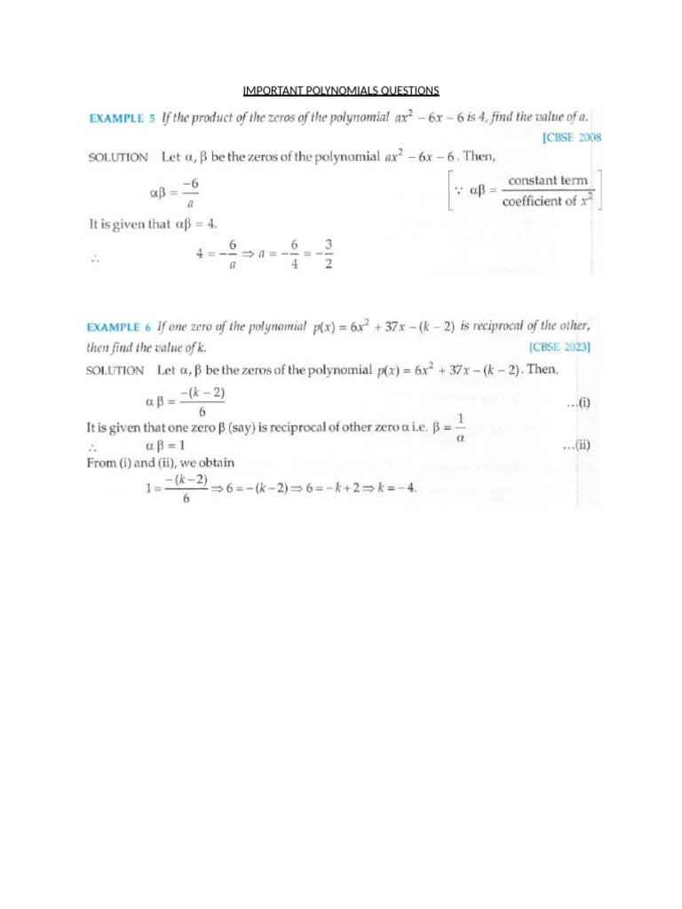 Important Questions for Class 10 Maths Chapter 2 Polynomials - CBSE Tuts