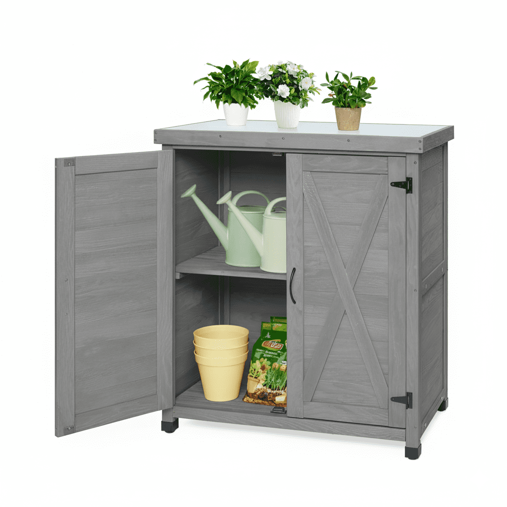 Potting Bench with Storage Cabinet and Metal Table Top for Outdoor ...