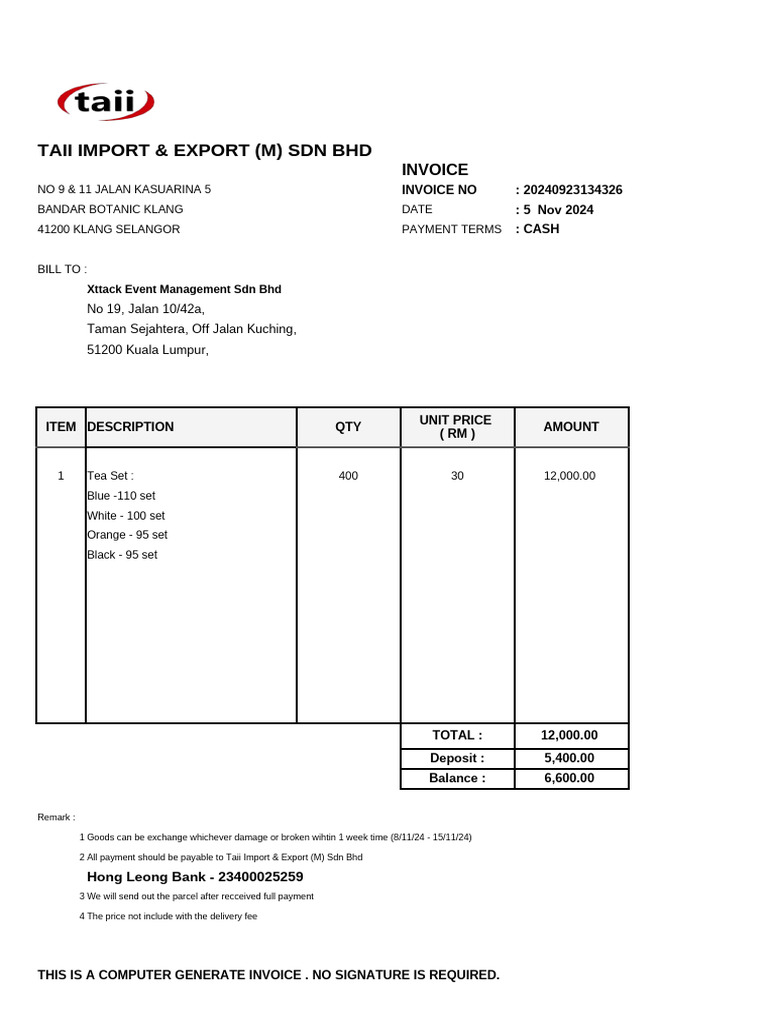 Invoice for Tea Set Purchase - Taii Import | PDF
