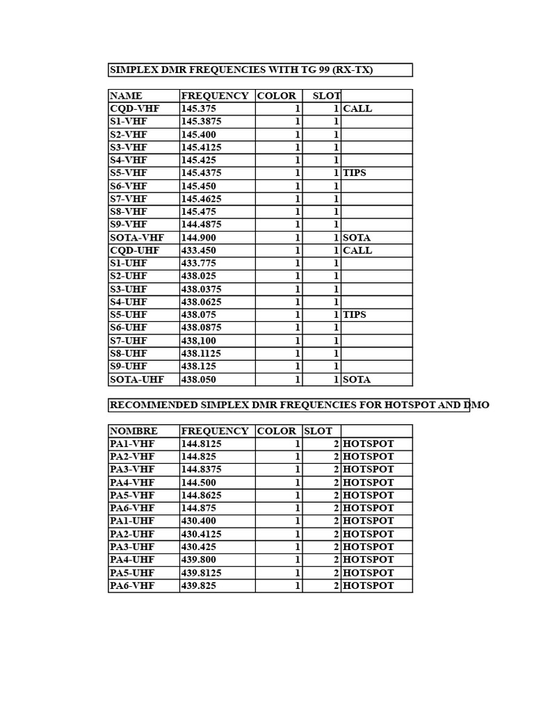Simplex DMR frequencies with TG 99 (RX-TX) | PDF