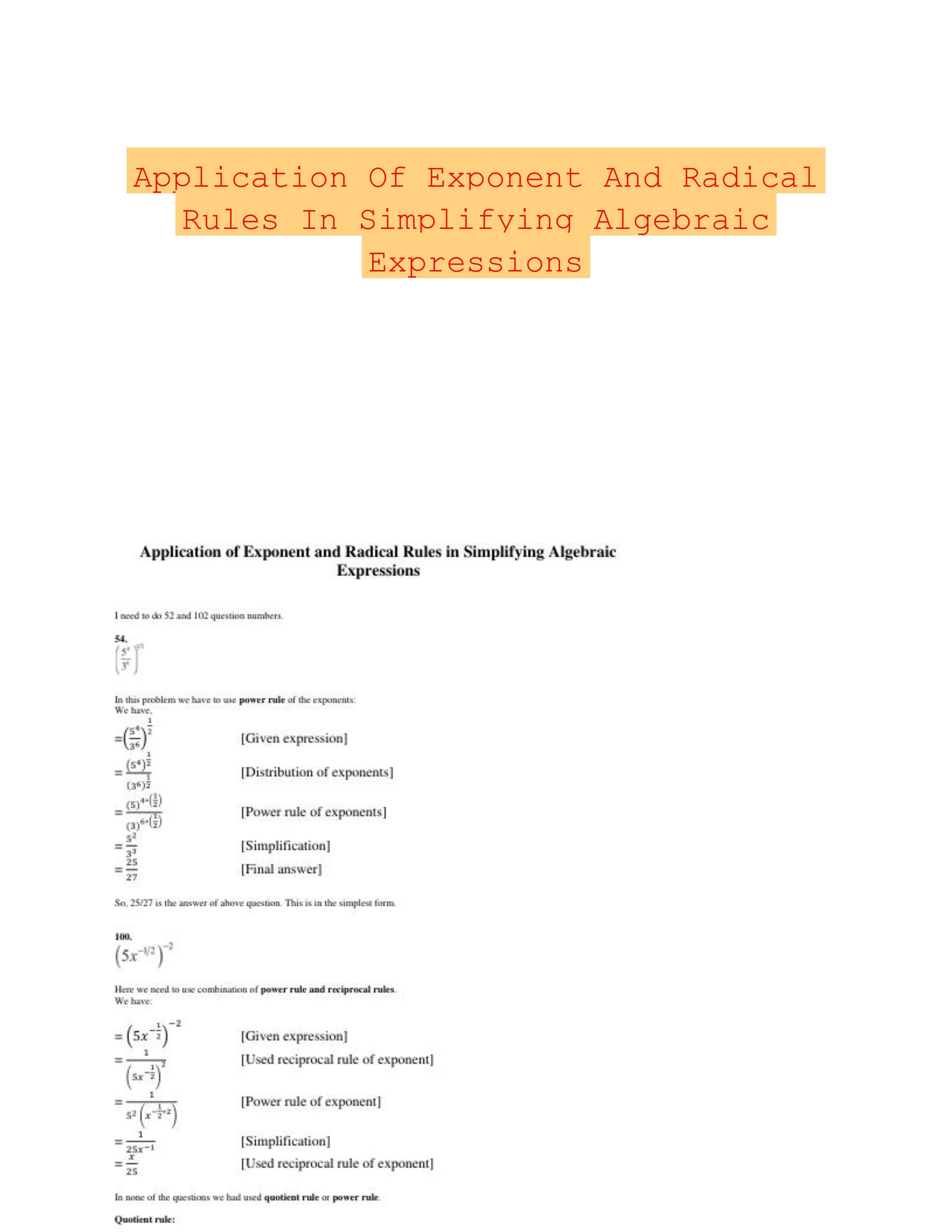 Application Of Exponent And Radical Rules In Simplifying Algebraic ...