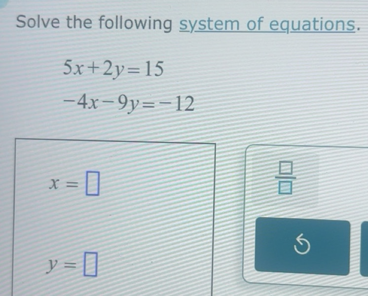 Solved: Solve the following system of equations. 5x+2y=15 -4x-9y=-12 x ...