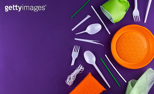 Disposable single-use plastic objects such as bottles, cups, forks ...