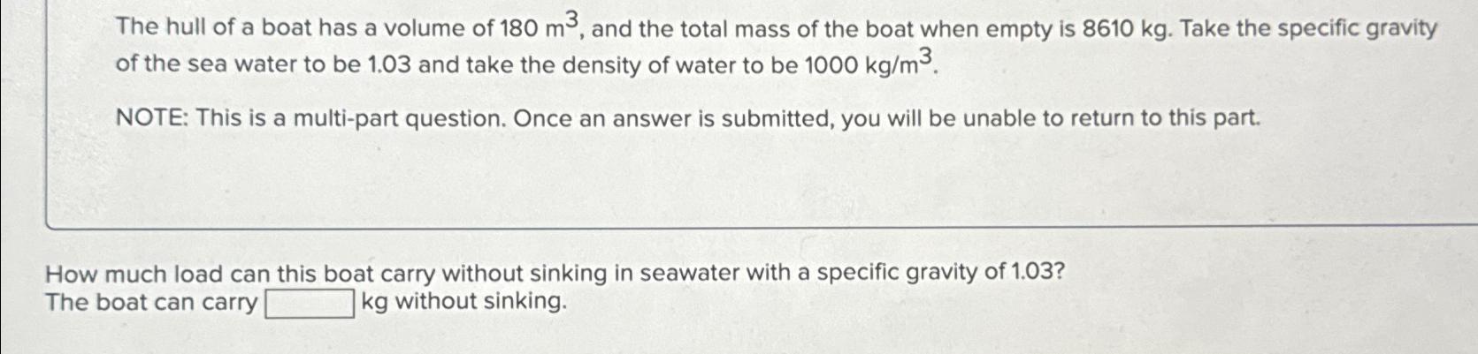 Solved The hull of a boat has a volume of 180m3, and the | Chegg.com