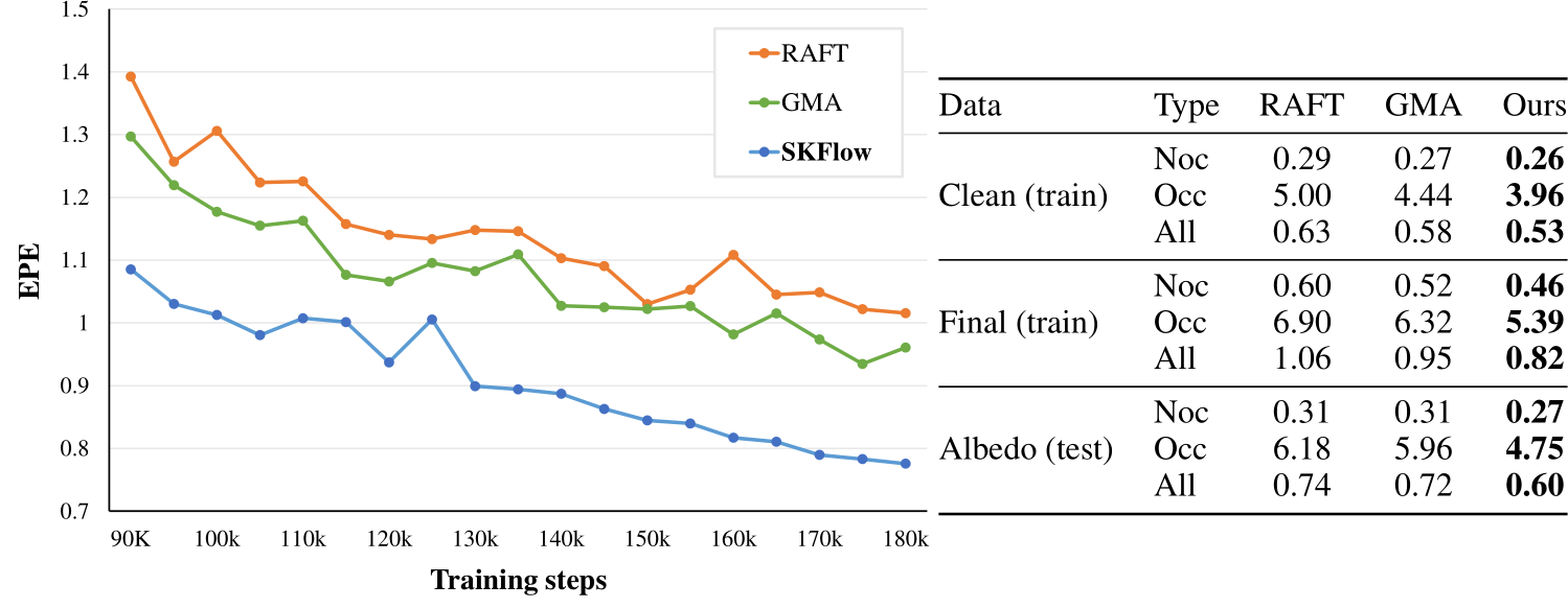 Comparison on Sintel and KITTI benchmarks. Optical flow accuracy is ...