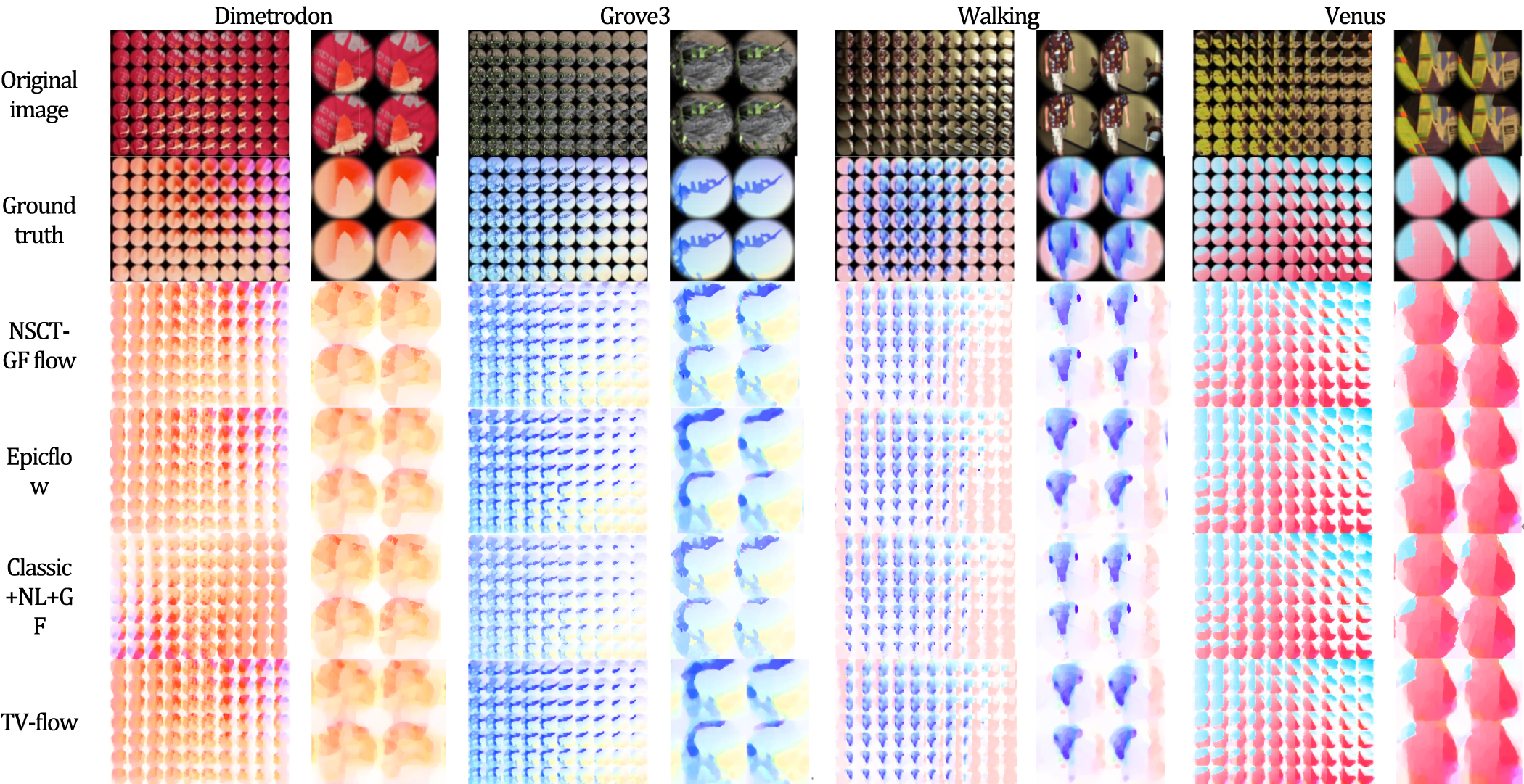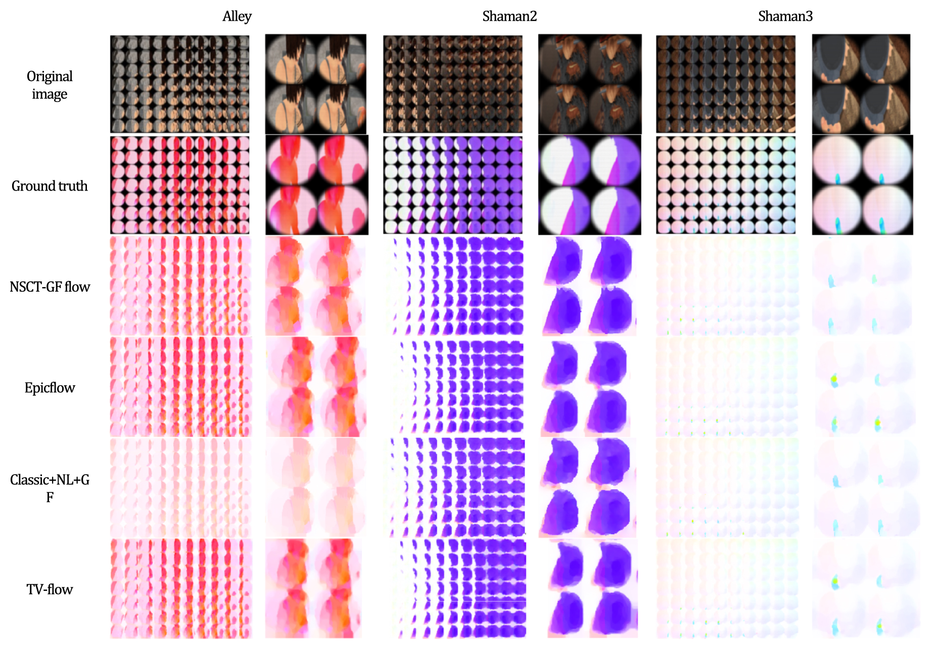 Optical flow results of Shama1 sequence in the MPI_Sintel dataset with ...