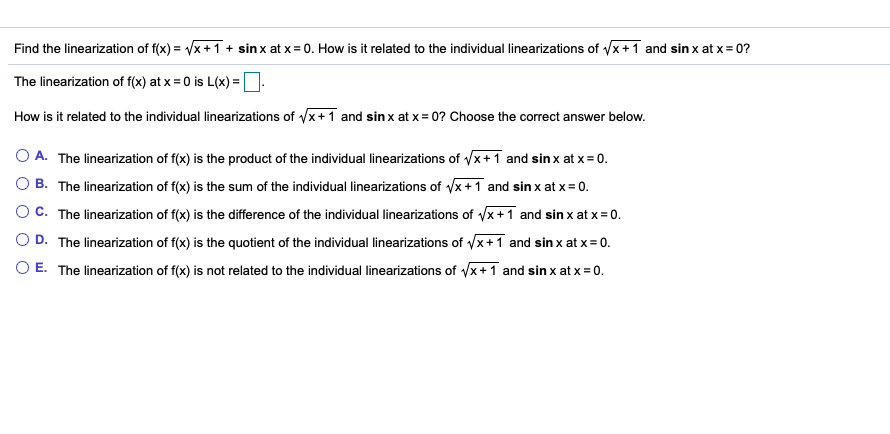 Solved Find a linearization of f(x) = sin x at a = 0 L(A) = | Chegg.com