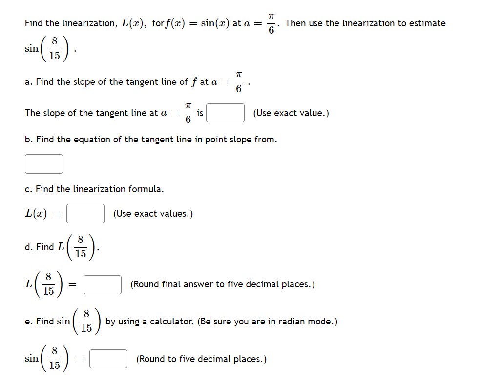[Math] find-the-linearization-lx-of-the-function-at-a-fx-sin-x-a-pi6 ...