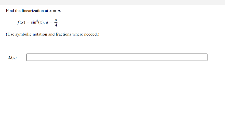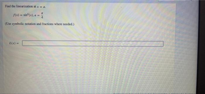 Solved Find the linearization at x = a. f(x) = sin"(x), a | Chegg.com