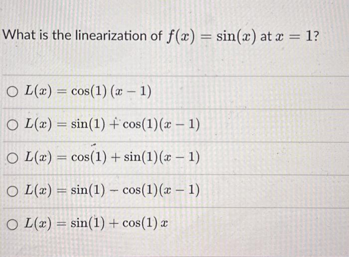 Solved What is the linearization of f(x)=sin(x) at x=1 ? | Chegg.com