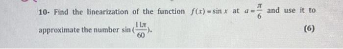 Solved 10. Find the linearization of the function f(x)=sinx | Chegg.com