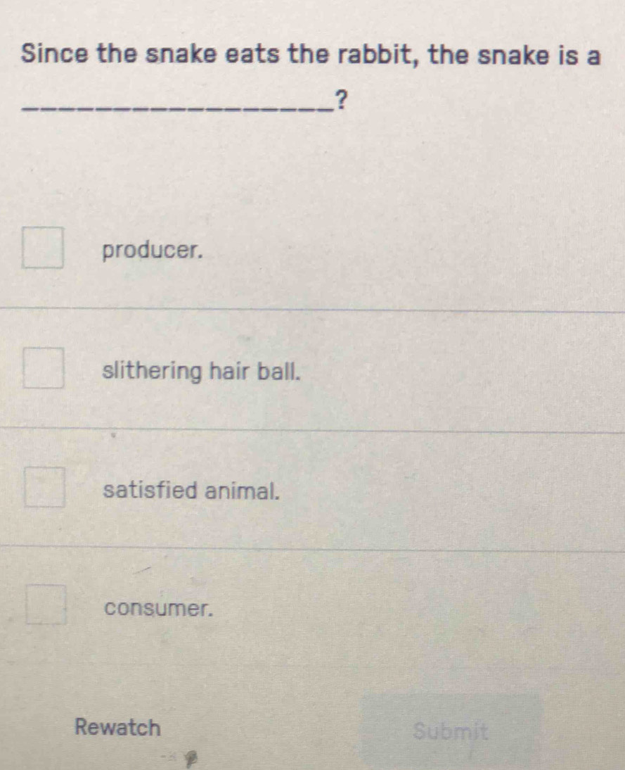 Solved: Since the snake eats the rabbit, the snake is a _? producer ...