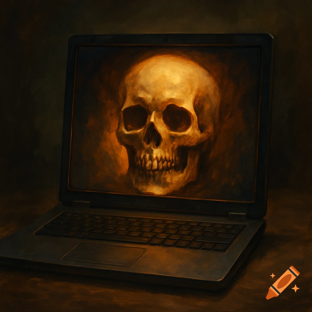 A laptop displays a human skull on its screen in a dark, painted style ...