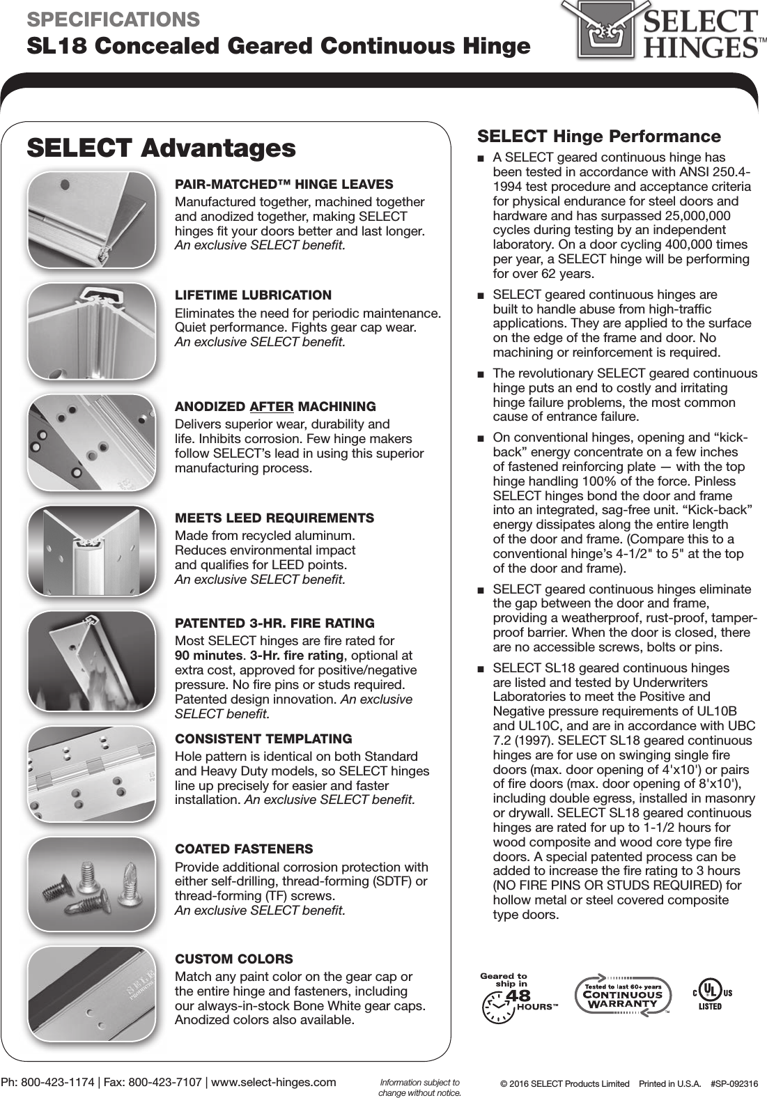 Select Hinges SL18 Spec Sheet SL18Spec web