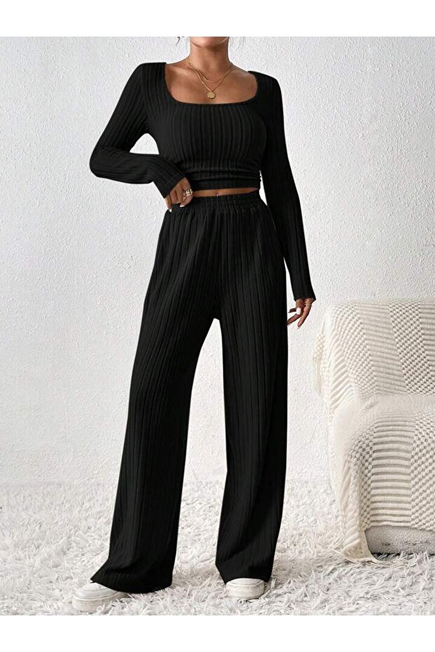 LOUİSA Women's Black Corded Fabric Knitted Fabric Square Neck Long ...