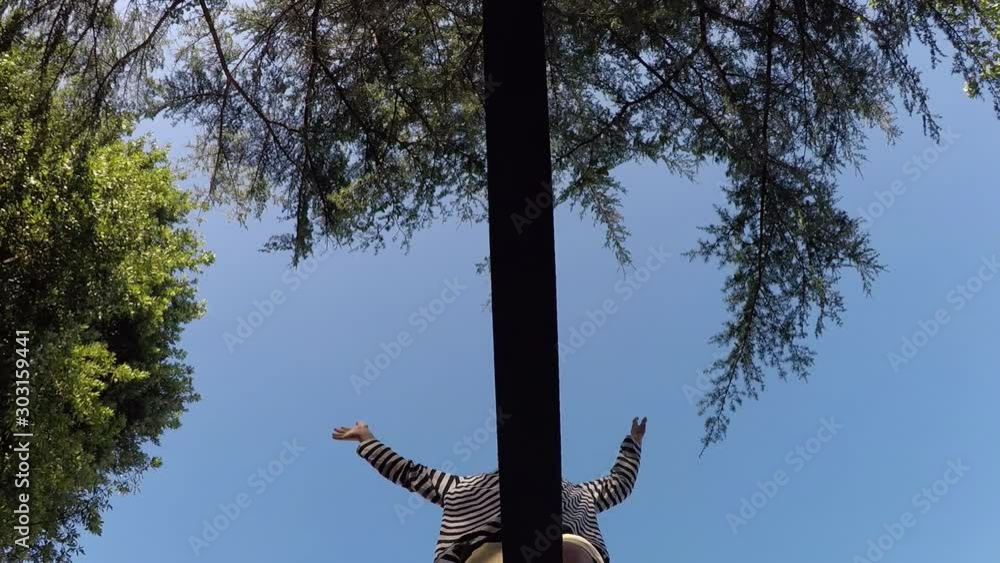 Slow motion walking a slackline beneath trees at a park. Low angle ...