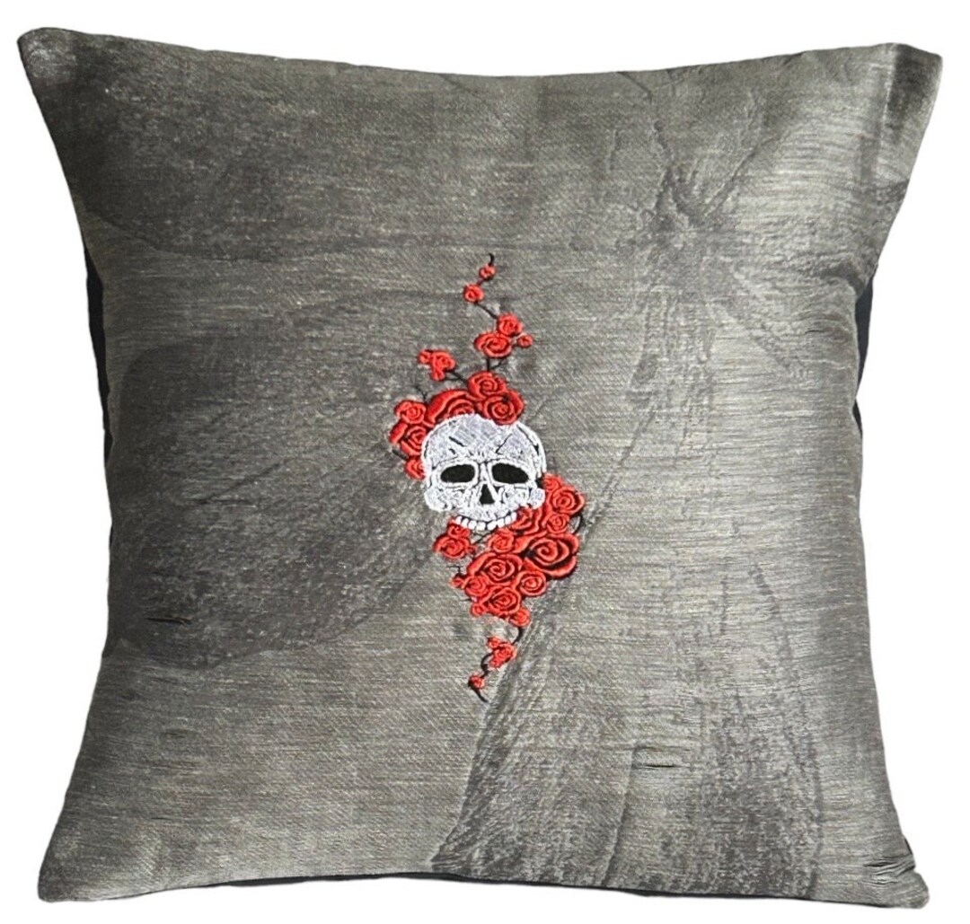 Skull & Roses, Embroidered, Overlay, Slashed, Cushion Cover, 16”x16 ...