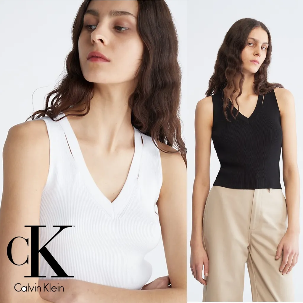 CK 캘빈클라인 여성 리브드 나시 니트 탱크탑 반팔 섹시 Ribbed Slashed Neckline Tank Top | 크로켓