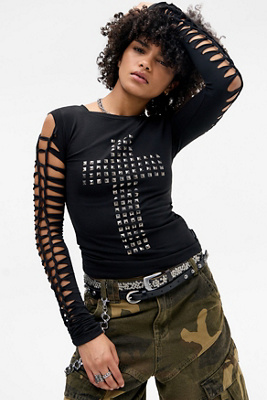 NEW Stone Embellished Cross Graphic Slashed Top | Clothes design, Style ...