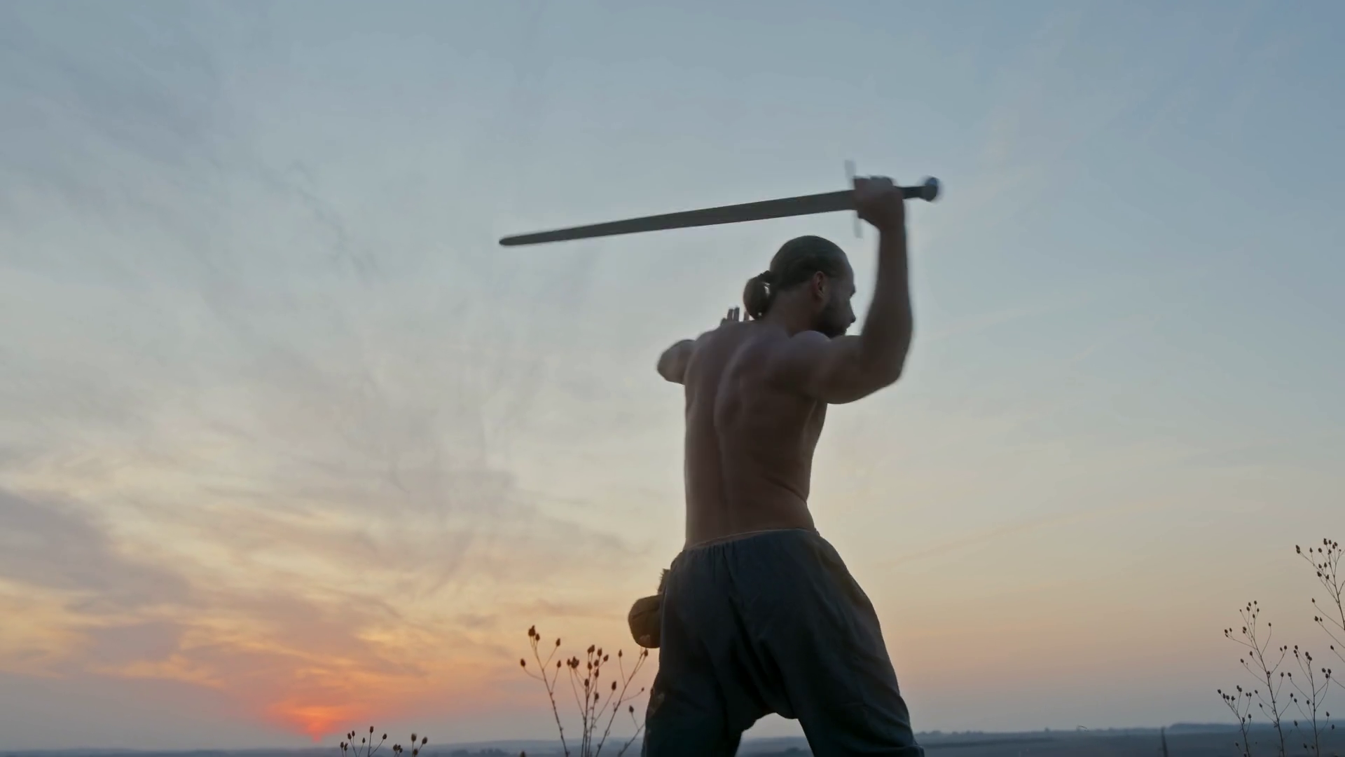 Muscular shirtless man with sword practicing slashing movements in a ...