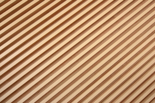 Light brown slats of wood. Lines of wooden slats form a striped texture ...