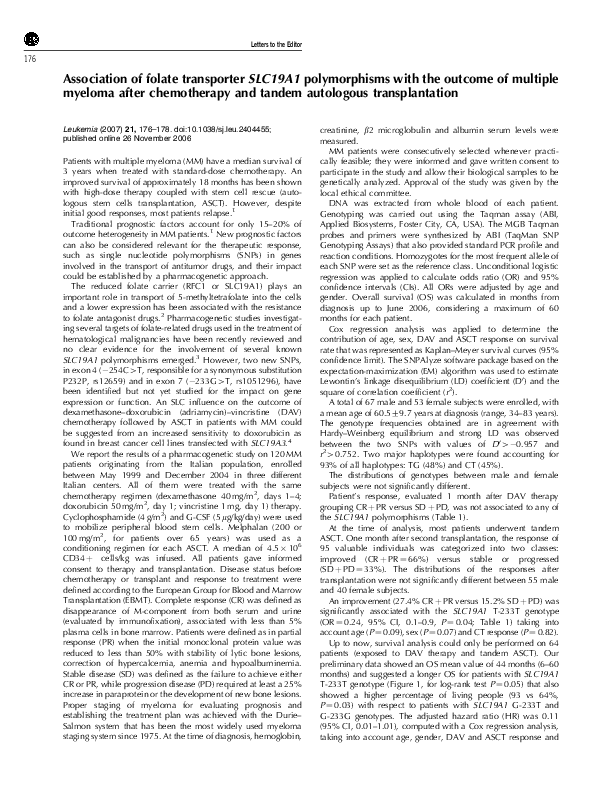 (PDF) SLC19A1 Polymorphisms and Multiple Myeloma Outcomes