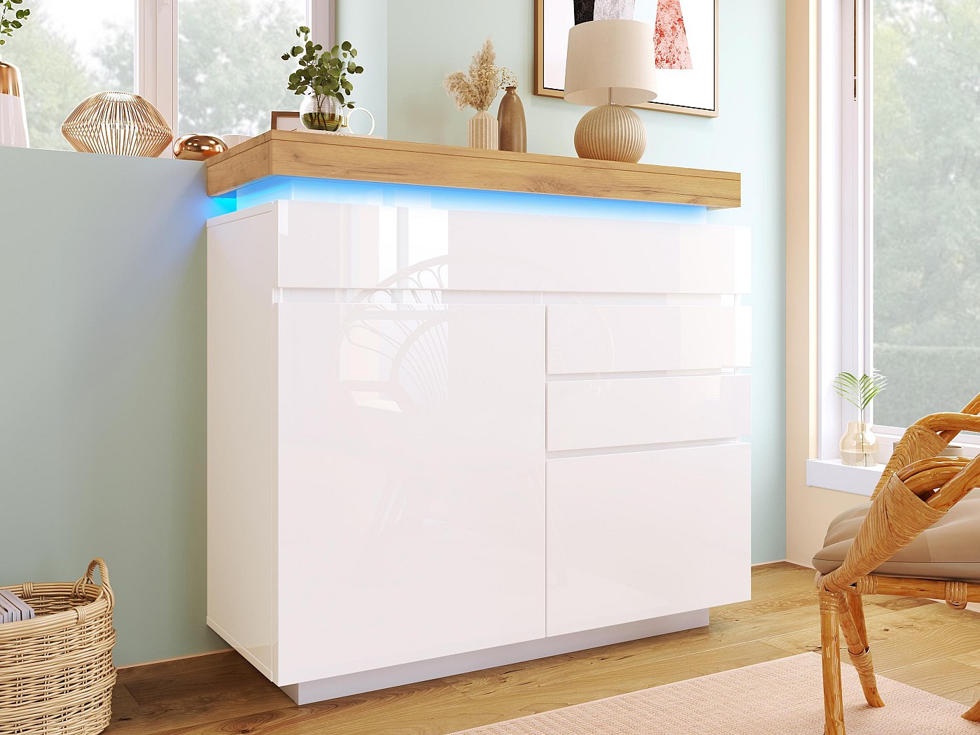 Commode avec LED - 3 tiroirs et 2 portes avec étagères réglables - Blanc