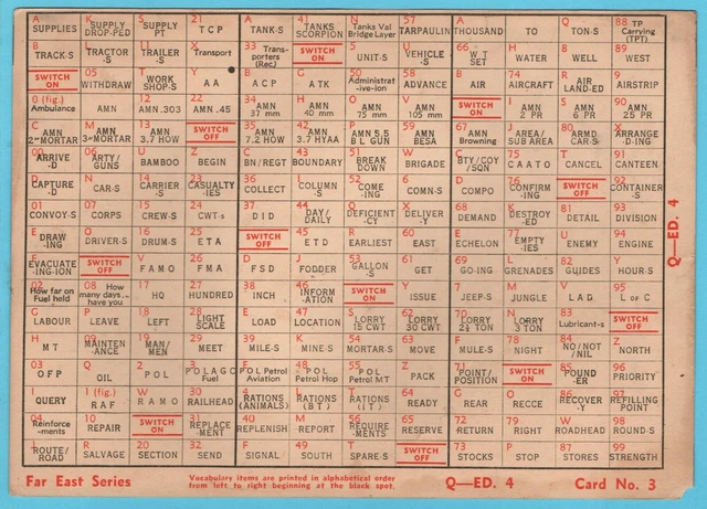 AUSTRALIAN/BRITISH ARMY SLIDEX RT Code Sheet-Far East Series Q-ED. 4 ...