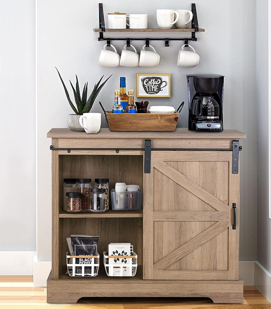 Phi Villa Farmhouse Coffee Bar Cabinet Sliding Barn Door Kitchen ...