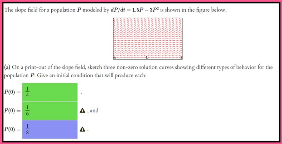 The slope field for a population P modeled by (dP)/(dt) = 1.5P - 3P^2 ...