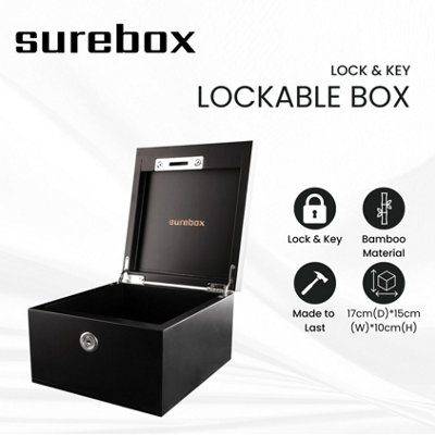 surebox Small Lock Box - Bamboo - Lock & Key - Secure Home Storage - Black