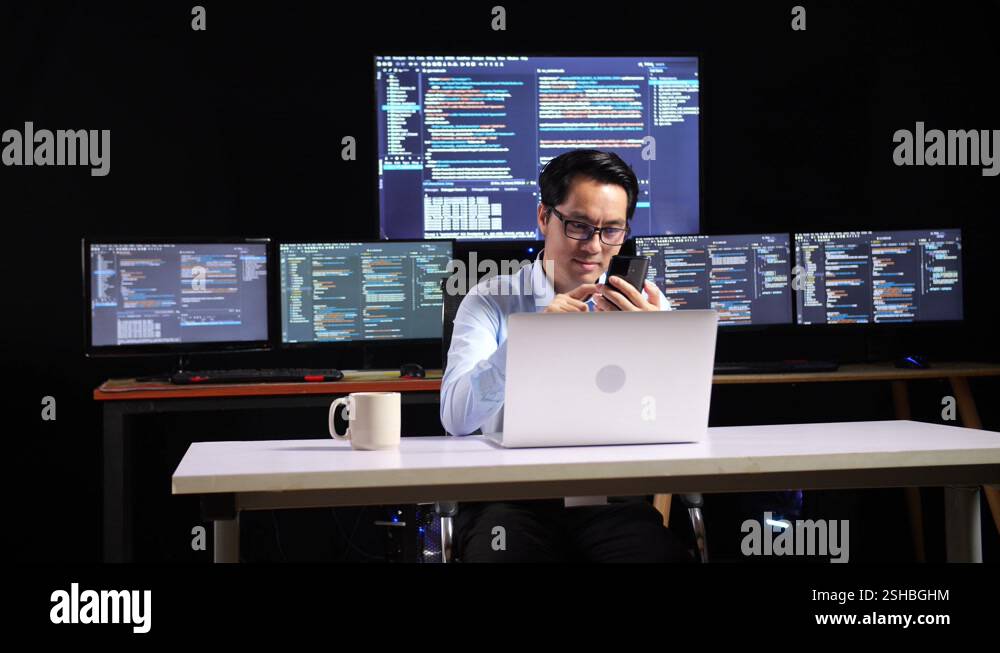 Asian Male Programmer Using Smartphone While Writing Code By A Laptop ...