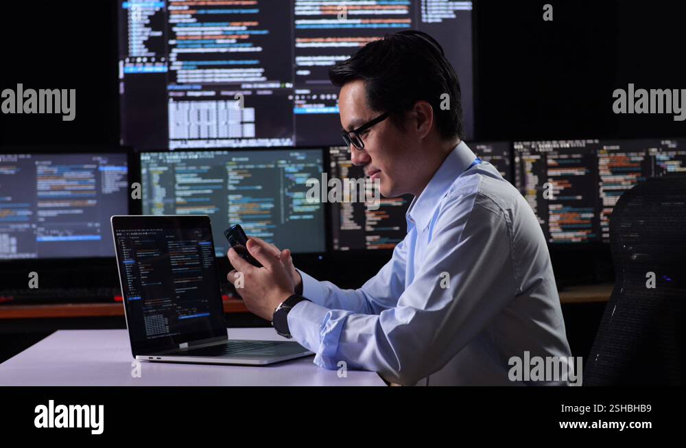 Side View Of Asian Male Programmer Using Smartphone While Writing Code ...