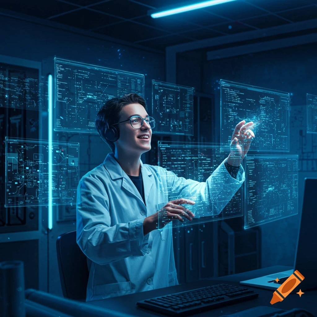 A smiling computer scientist in a lab coat and headphones interacts ...
