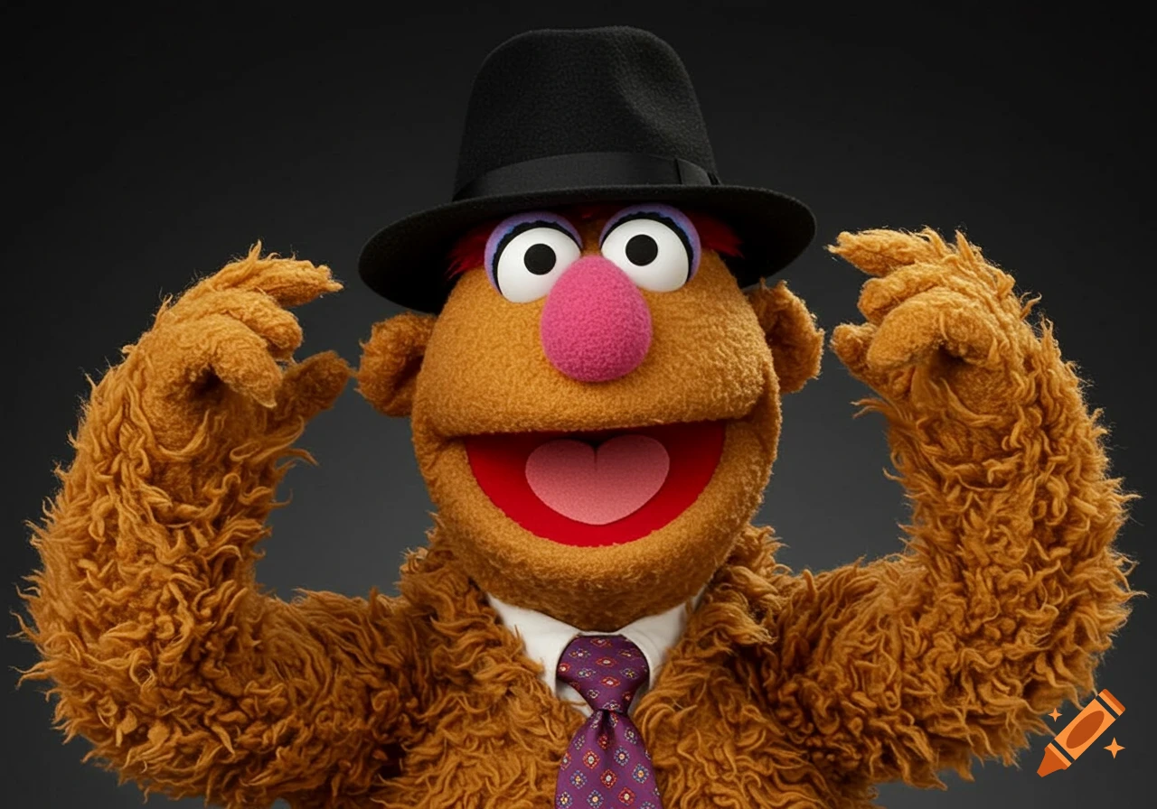 Fozzie Bear, a Muppet character, smiling and holding his hat on Craiyon