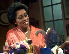 A muppet character with blonde hair and a bow, smiling in a dressing ...